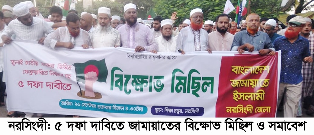 জেলা সেক্রেটারি আমজাদ হোসেন বলেন, আগামী জাতীয় নির্বাচনে সংসদের উভয় কক্ষে পিআর পদ্ধতি চালু, অবাধ-সুষ্ঠু ও গ্রহণযোগ্য নির্বাচনের লক্ষ্যে সবার জন্য লেভেল প্লেয়িং ফিল্ড নিশ্চিত, ফ্যাসিস্ট সরকারের সব জুলুম-নির্যাতন, গণহত্যা ও দুর্নীতির বিচার দৃশ্যমান, স্বৈরাচারের দোসর জাতীয় পার্টি ও ১৪ দলের কার্যক্রম নিষিদ্ধ করতে হবে। এ ৫ দফা দাবি না মানা পর্যন্ত কোন নির্বাচন জনগণ মেনে নিবে না। ৫ দফা দাবি পূরণ হলে এদেশের জনগণ নির্বাচনের দিকে আগাবে। বিক্ষোভ সমাবেশ শেষে মিছিল সহকারে শহরের বিভিন্ন সড়ক প্রদক্ষিণ করে নরসিংদী প্রেস ক্লাবের সামনে এসে শেষ হয়।